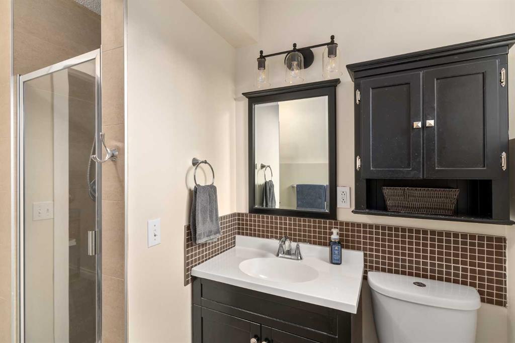 Both bathrooms have been fully renovated—the upper bath features Rubber Tree cabinetry with a marble top, backsplash, tile floors, and new fixtures. The lower level includes a modern walk-in shower, updated cabinetry, and stylish tilework.